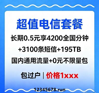 电信专属福利神卡!长期0.5元月租,4200全国通话分钟随便造,3100条短信任性发,195TB国内通用流量+0元不限量包畅用到底~ 正规包过户,价格1xxxx,闭眼冲就对了!