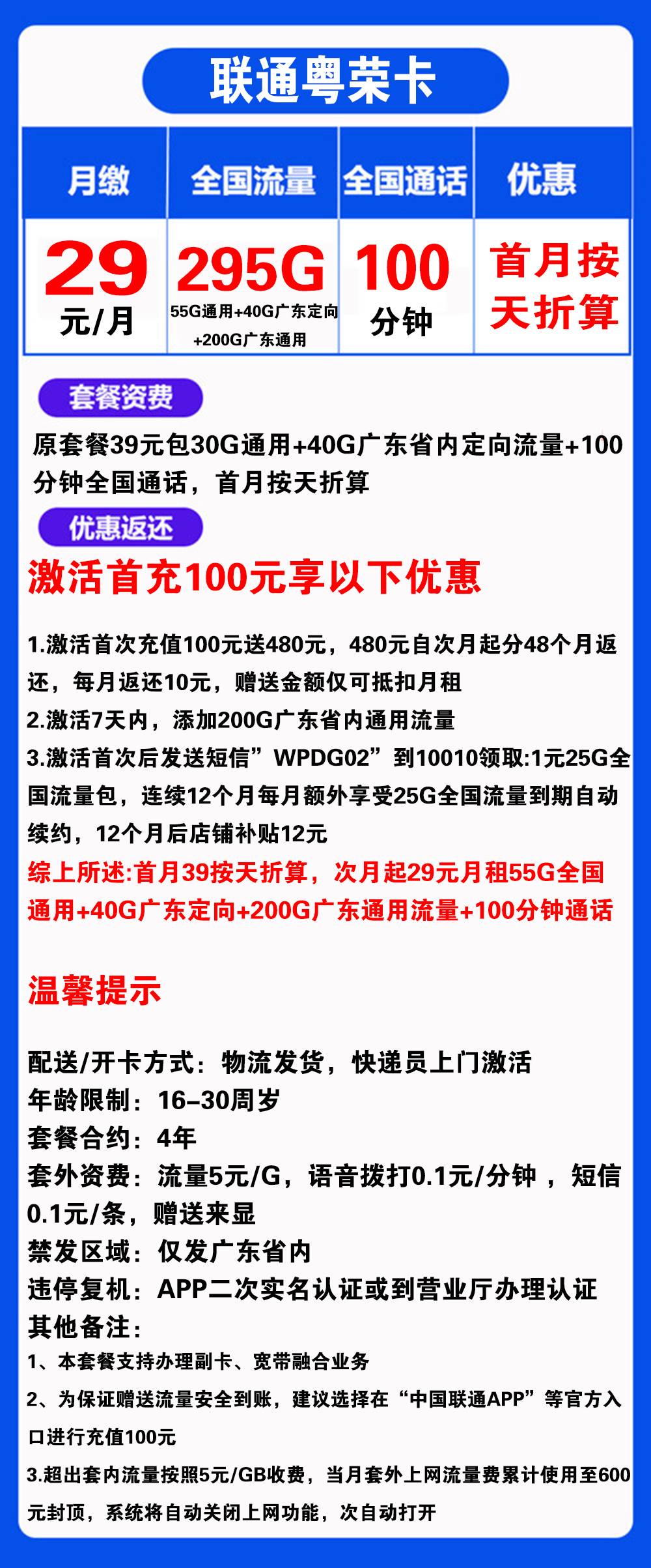 联通粤荣卡29元295GB流量+100分钟通话【仅发广东省内】