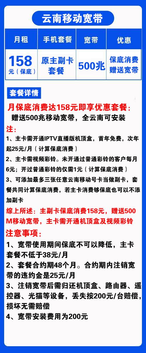 云南移动宽带158元500M宽带+原手机卡套餐+IPTV直播【仅云南省内办理】