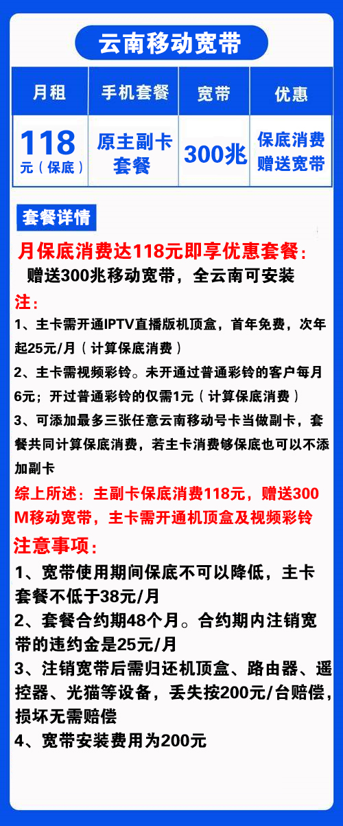 云南移动宽带118元300M宽带+原手机卡套餐+IPTV直播【仅云南省内办理】