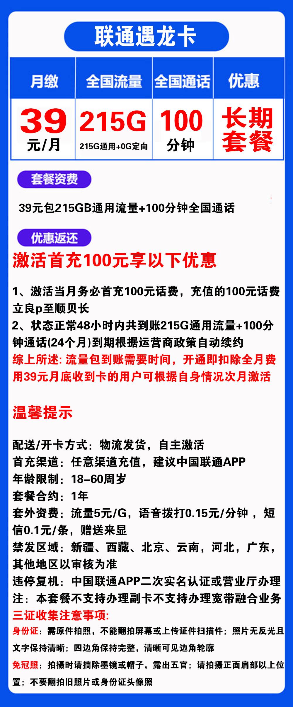 联通遇龙卡39元215G流量+100分钟通话【发全国】【长期套餐】